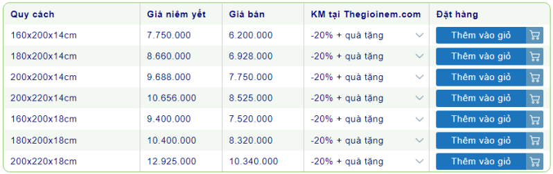 2. Bảng giá nệm bông ép Everon khuyến mãi 2021