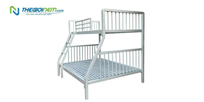 Đây là mẫu giường sắt được nhiều gia đình lựa chọn, bởi vì giường có 2 tầng rất thích hợp với những tổ ấm có 2 con. Bên cạnh đó, còn giúp tiết kiệm diện tích phòng ngủ và mang đến sự thẩm mỹ bởi giường có màu sắc tinh tế. Đảm bảo giường có độ vững chắc vì được sản xuất từ sắt cao cấp, chắc chắn mang đến sự an toàn khi sử dụng. Không những thế, trọng lượng của giường cũng không quá nặng, giúp tiết kiệm thời gian lắp ráp hay tháo giường.