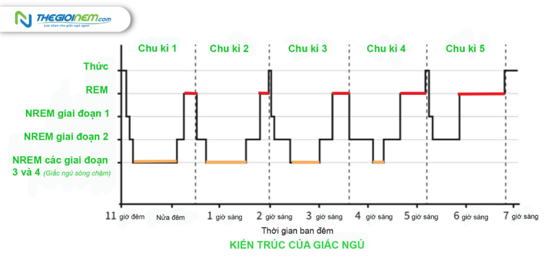 Giấc ngủ được chia làm 2 loại là REM (cử động mắt nhanh) và NREM (không cử động mắt nhanh). Trong chu kỳ giấc ngủ luôn bắt đầu bằng giấc ngủ NREM, nối tiếp đó là khoảng thời gian ngắn của giấc ngủ REM. Chu kỳ này lặp lại 90 phút 1 lần trong 1 đêm. Có 4 giai đoạn trong 1 chu kỳ ngủ: